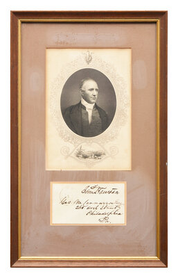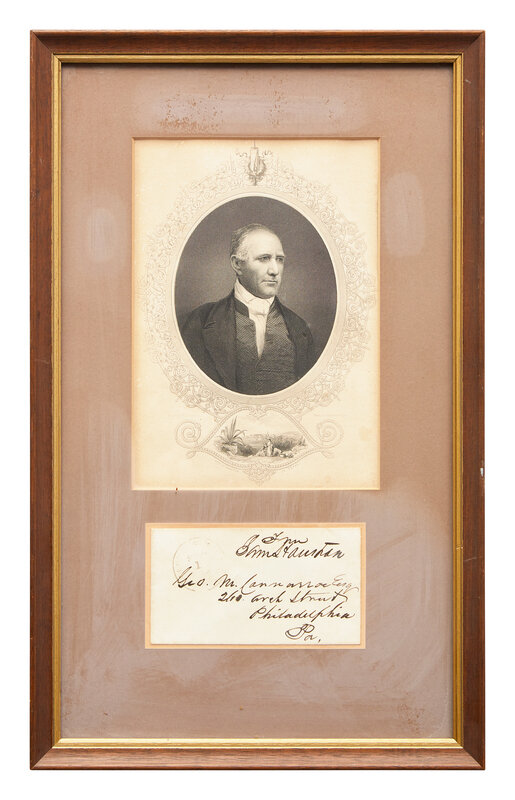 Washington, D.C., no date (ca. 1853-59). Mailing envelope free-franked by Sam Houston, presumably as a Senator from Texas, and addressed by him to George M. Conarroe, Esq. of Philadelphia. 3 x 5 in. (76 x 127 mm). In mat with an engraved portrait of Houston, and unexamined out of frame, 17 3/4 x 11 in. (451 x 279 mm).