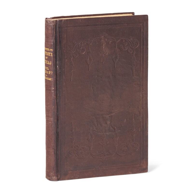 New-York: Published by Wiley & Putnam, 1838. First edition. 12mo. 215 pp. Illustrated with folding lithographic frontispiece map of Texas by Baker. Publisher's brown cloth-covered boards, decorated in blind and in gilt, spine expertly repaired, light soiling to boards; all edges trimmed; bookseller's ticket on front paste-down (W.A. Leary's, Philadelphia); foxing to endpapers; light to moderate foxing to map and text; short dampstaining along bottom edge of most leaves. Basic Texas Books 151; Clark III:215; Graf 3010; Howes N-115; Sabin 54948; Streeter, Texas 1318