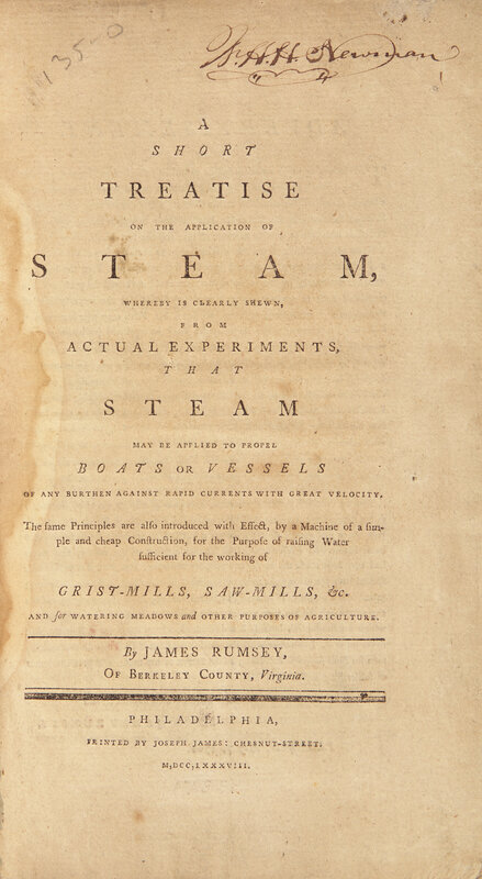 [Travel & Exploration] Rumsey, James. A Short Treatise on the Application of Steam, Whereby is Clearly Shewn, From Actual Experiments, That Steam May be Applied to Propel Boats or Vessels...