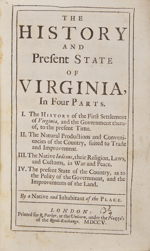A near-fine first edition of this important history of Virginia. "After John Smith, the first account of this colony, the first one penned by a native and the best contemporary record of its aboriginal tribes and of the life of its early settlers." (Howes)