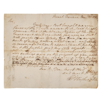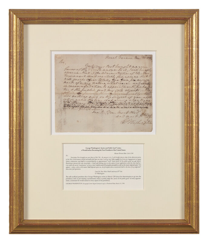 Mount Vernon, March 15, 1789. Single sheet, 6 1/2 x 8 in. (165 x 203 mm). Washington's own retained copy of his autograph letter, signed by the President-elect, to Frederick Phile, written on the excised integral leaf of Phile's March 7 letter to Washington (now in the Library of Congress): "Sir, Yesterdays Post brought me your favor of the 7th--In answer to it, I will briefly observe that if the Administration of the New Government should inevitably fall upon me that I will go into Office totally free from pre-engagements of every nature whatsoever, and shall in recommendations to appointments will make justice & the public good my sole objects. Resolving to pursue this rule, invariably--I shall add nothing more on the subject of your application until the time shall arrive when the merits and justice of every claim appear--when, so far as the matter depends upon me, the principles above mentioned shall to the best of my judgement have their full operation. I am Sir, Your Most Obedt and Hble Serv. Go: Washington". Docketed on verso in Washington's hand, "To Doctr Fred: Phile 15th Mar. 1789." Various emendations to text in Washington's hand. Creasing from old folds; scattered ink stains, especially at right margin; in mat and frame with a printed description, 18 1/2 x 16 in. (457 x 406 mm). Library of Congress, George Washington Papers, Series 2, Letterbooks 1754-1799, p. 20