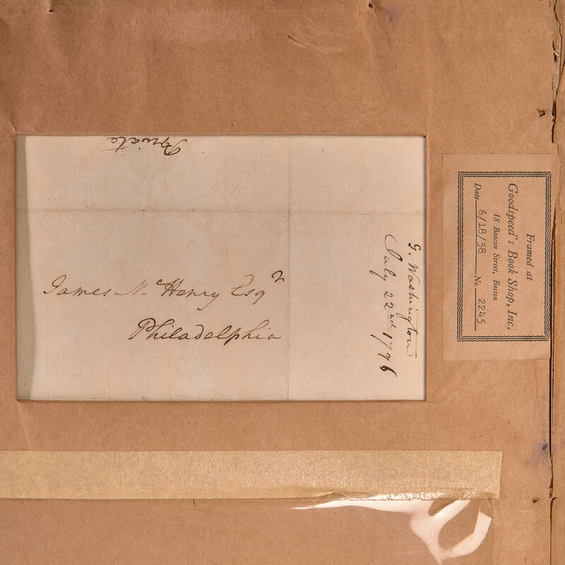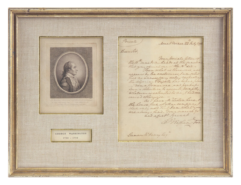 Mount Vernon, July 22. 1796. One-page autograph letter on bifolium, signed by George Washington as President and marked "Private" by him, to Secretary of War James McHenry, regarding the construction the frigate Crescent. In full: "Your private letter of the 16th came to my hands at the same time that your official one of the 18th did.-- From what is there said, and appears by the enclosure, I am satisfied no unnecessary delay respecting the Algerine Frigate has taken place. From a former one, and perhaps from a solicitude to execute promptly, whatever is entrusted to me, I had conceived otherwise.--As I have Mr. Liston here, & the house full of other company, I shall only add that I am-what you will always find--Your sincere frd. and affect. Servant G: Washington". Addressed by Washington on verso of integral leaf and signed by him "Private", docketed on same in another hand. Creasing from old folds. 9 1/8 x 7 1/2 in. (232 x 190 mm). Silked. In mat with an engraved portrait of Washington, and in frame, 14 1/2 x 19 in. (368 x 483 mm).