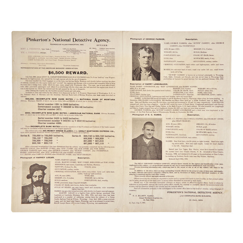 St. Paul, Minnesota: Pinkerton's National Detective Agency, August 5, 1901. Single sheet, 14 x 17 in. (356 x 432 mm). Printed wanted circular for Harvey Logan ("Kid Curry"), Robert LeRoy Parker ("Butch Cassidy"), Harry Longabaugh ("the Sundance Kid"), and Orlando Camillo Hanks ("Deaf Charley"); with printed photographic images of Logan, Parker, and Hanks. Creasing from old folds; closed tear in bottom right edge; scattered wear and short closed tears along edges; scattered soiling.