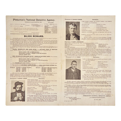 Circulated by the Pinkerton Detective Agency on behalf of the Great Northern Express Company, this circular offers up to $6,500 for information leading to the capture and prosecution of these men. It recounts their crime, that on "July 3rd, 1901, about 2:30 P.M., Great Northern Railway Express train No. 3 was 'held up' near Wagner, Montana, by highwaymen, who opened the through express safe by the use of dynamite. One man boarded the blind baggage car...and shortly before reaching the place of robbery, crawled over the enginetender and 'covered' the engineer and fireman with a revolver and compelled them to stop...Two men, one on each side of the train, with rifles prevented passengers and others from interfering...After robbing the express car, the bandits mounted horses and rode away."
