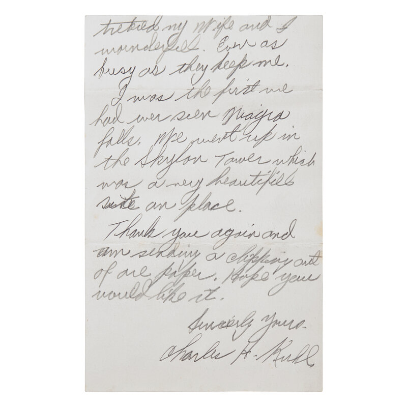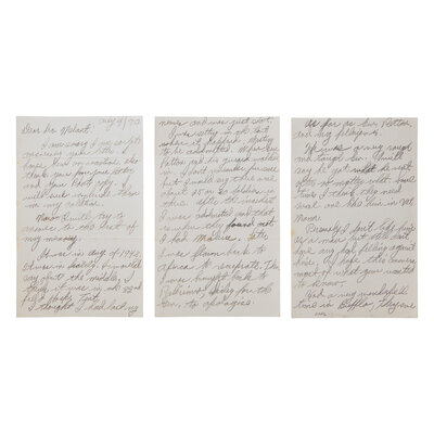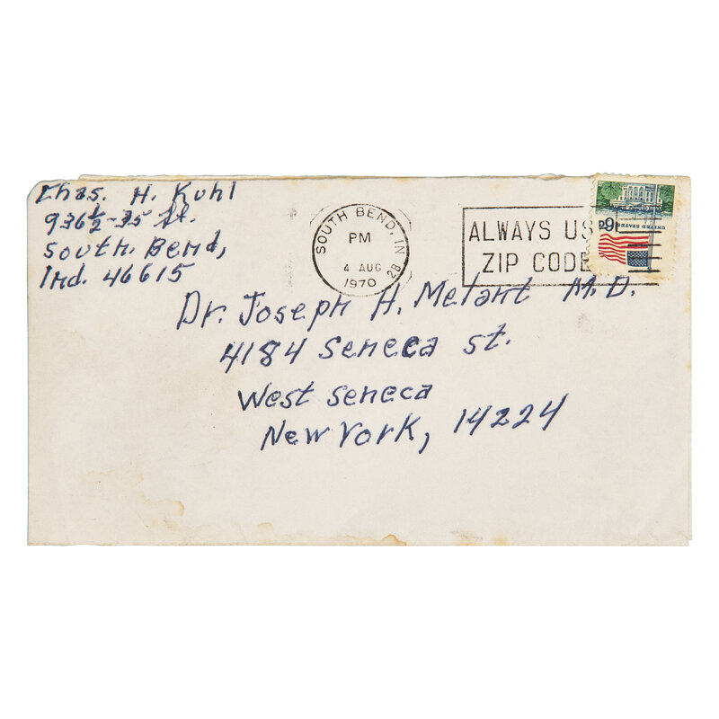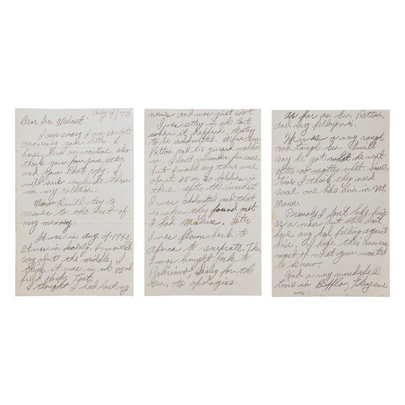 South Bend, Indiana, August 4, 1970. Three sheets, each measuring 8 x 5 in. (203 x 127 mm). Autograph letter in pencil, signed by Charles H. Kuhl to Dr. Joseph H. Melant of West Seneca, New York: "I am sorry I am so late answering your letter. I have been on vacation. Also thank you for your letter and your Photo copy. I will sure include them in my collection. Now I will try to answer to the best of my memory. It was in Aug. of 1943. It was in Sicily. I would say about the middle. I think it was in the 82nd field Hosp Tent. I thought I had lost my nerves and I was just shot. I was sitting in the tent when it happened. Waiting to be admitted. When Gen. Patton and his guard walked in. I don't remember for sure but I would say there were about 25 or 30 soldiers in there. After the incident I was admitted and that is when they found out I had malaria. Later I was flown back to Africa to recuperate. Then I was brought back to Palermo, Sicily for the Gen. to apologize. As far as Gen. Patton and my feeling is. He was a very rough and tough Gen. I will say he got what he went after no matter what. Some times I think they need some one like him in Vet,nam (sic). Personally I don't like him as a man but still don't have any hard feelings against him. I hope this answers most of what you wanted to know..." With original mail envelope. Sheets creased from when folded; scattered smudging and soiling.