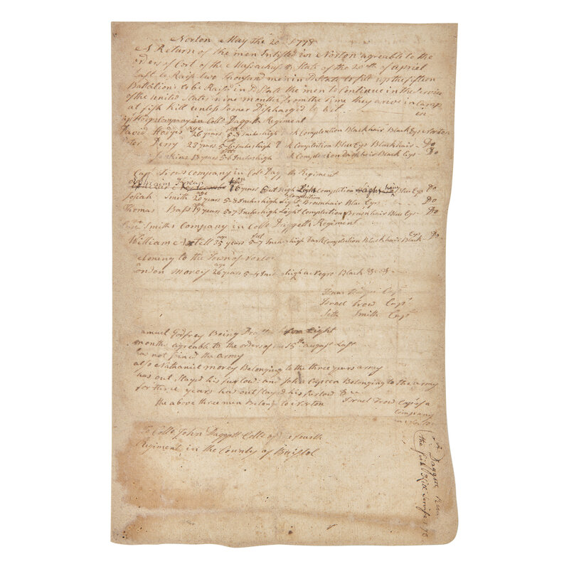 Norton, Attleboro, etc., Massachusetts, 1778. Single sheet, 13 1/4 x 8 5/8 in. (336 x 219 mm). Two-page manuscript document, being a muster list for service in the Continental Army: the recto listing eight men belonging to three companies in Colonel John Daggett's regiment, including the mention of one African-American solider, a "London Morey", and listing the men's age, height, color of complexion, hair, eyes, and town; verso with manuscript tabular list of 20 men recruited from Daggett's militia, listing their company, name, age, height, complexion, eye color, town and county or country (the last four being from France). Creasing from old folds; scattered soiling; repairs along edges; some text slightly faded.