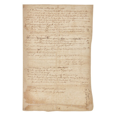A rare Revolutionary War muster list from Massachusetts, for men enlisted for service in the Continental Army, and including mention of one African-American soldier, a man named London Morey. While Morey served in the militia of Colonel John Daggett's regiment, he was ultimately rejected for service in the Continental Army.
