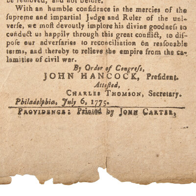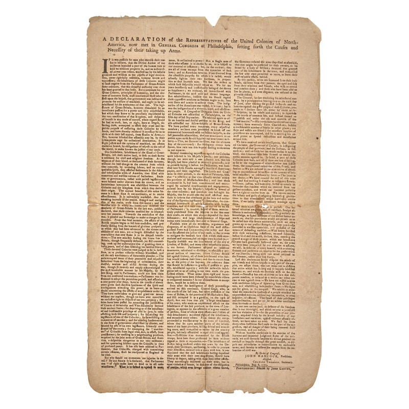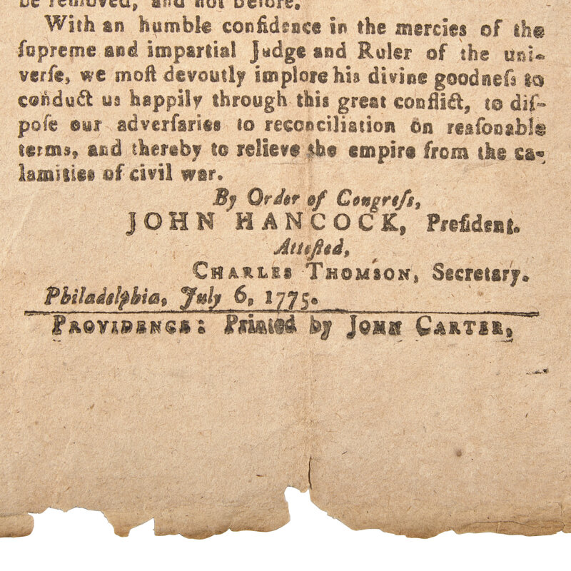 Providence: Printed by John Carter, 1775. Printed broadside, 16 5/8 x 10 3/8 in. (422 x 263 mm). Text in three columns (recto only). Signed and dated in type at bottom by John Hancock as President of the Continental Congress and Charles Thomson as Secretary, Philadelphia, July 6 ,1775. Old docket on verso, "Declaration of Independence". Creasing from old folds, long separations along same; scattered edge wear; scattered light soiling. Alden 627; ESTC W15200; Evans 14548