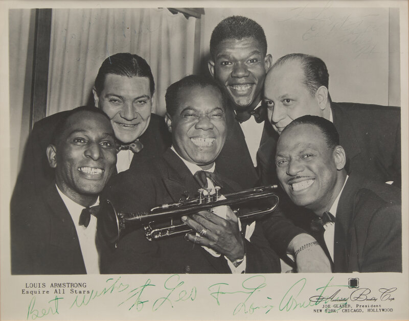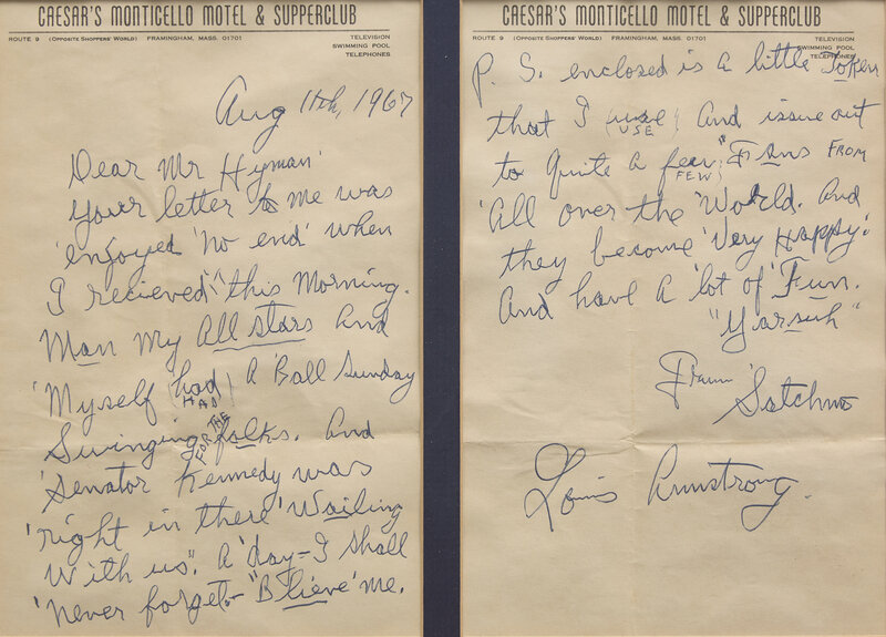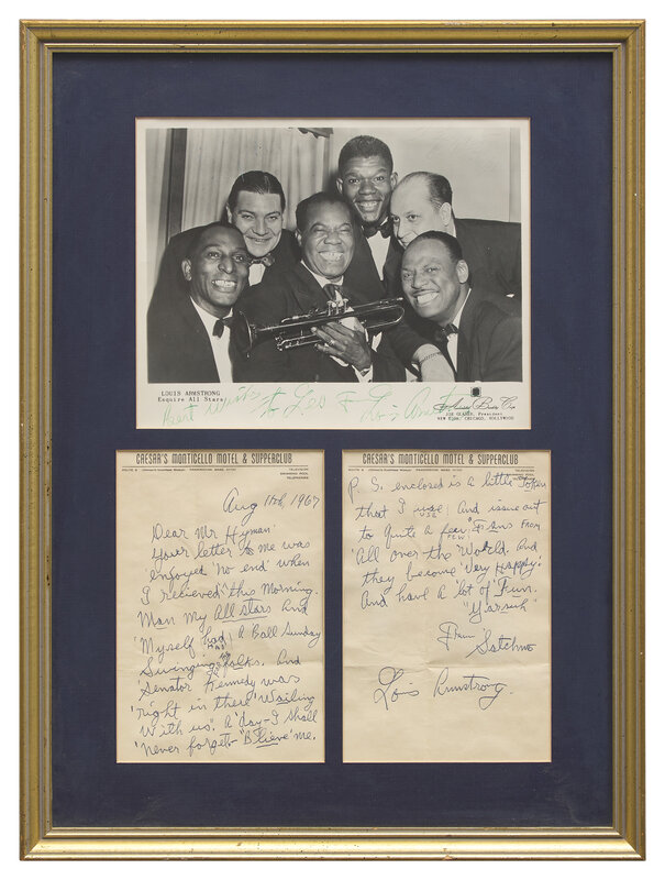 Framingham, Massachusetts, August 11, 1967. Two sheets, approximately 8 1/8 x 5 1/8 in. (206 x 130 mm) (sight). Autograph letter on Ceasar's Monticello Motel & Supperclub letterhead, signed by Louis Armstrong to Lester Hyman: "Dear Mr. Hyman Your letter to me was enjoyed no end when I recieved (sic) it this morning. Man my All stars and Myself had a Ball Sunday Swinging For the folks. An Senator Kennedy was right in there Wailing With us. A day--I shall never forget--Blieve (sic) me. P.S. enclosed is a little token that I use and issue out to quite a few Fans From All over the World. And they become 'Very Happy!' And have a lot of Fun...From Satchmo/Louis Armstrong". Creasing from old folds. In mat with an 8 x 10 in. (203 x 254 mm) black and white photograph of Louis Armstrong and his "All Stars", inscribed below image, "Best Wishes to Les From Louis Armstrong." Photo also signed at top left by Cozy Cole, and top right by Earl "Fatha" Hines; both inscriptions faded; image lightly creased. Both items unexamined out frame, 21 1/8 x 15 3/4 in. (536 x 400 mm).