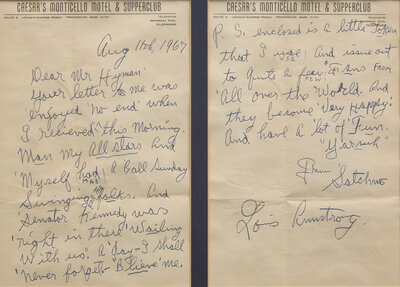 In his book, JFK, The Kennedys and Me, Hyman describes the context of this letter, after Armstrong and his band played for a Democratic campaign event, "...we were able to convince the great Louis Armstrong and his All Stars to give a concert (gratis). Even though only 300 people were there, Mr. Armstrong gave a full concert as he would have given to 30,000 people. He was wonderful...in response to my thank-you-note, I received a hand-written letter from Louis Armstrong...I keep that letter on the wall in my office as one of my most treasured gifts..."