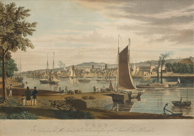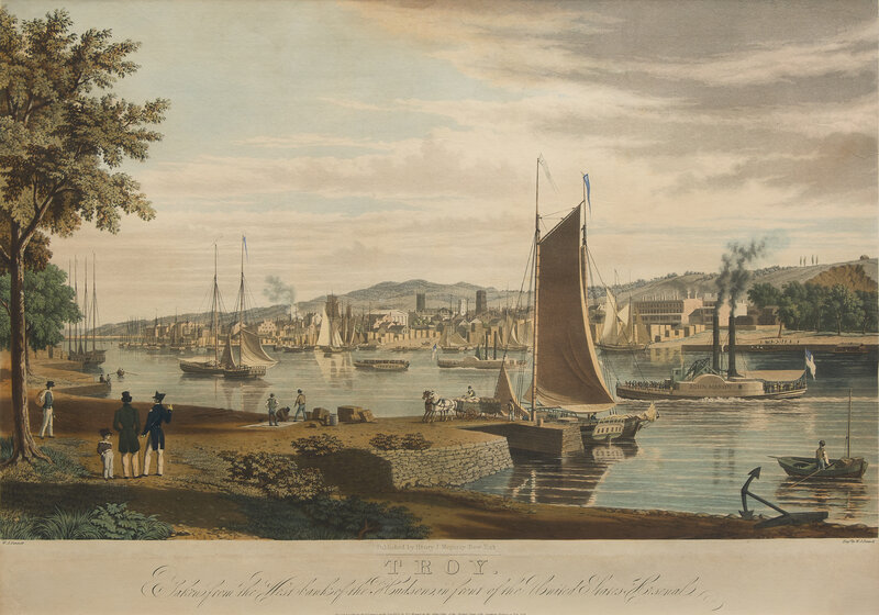 A handsome first state of Bennett's view of Troy, New York. "As is typical of Bennett's work, this view of Troy is a well-balanced pictorial image, containing elements of landscape and riverscape painting. There is a careful architectural notation of buildings, an appreciation of details in the varying structures of rivercraft, a grasp of the liquid quality of water, and an intense awareness of light. The result is an elegant topographic transcription of what is basically an ordinary urban scene." (Deak)
