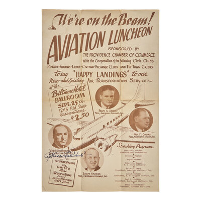 Poster for the Aviation Luncheon at the Biltmore Hotel Ballroom in Providence, Rhode Island, signed by WWI flying ace and Medal of Honor recipient, Captain Eddie Rickenbacker (1890-1973).
