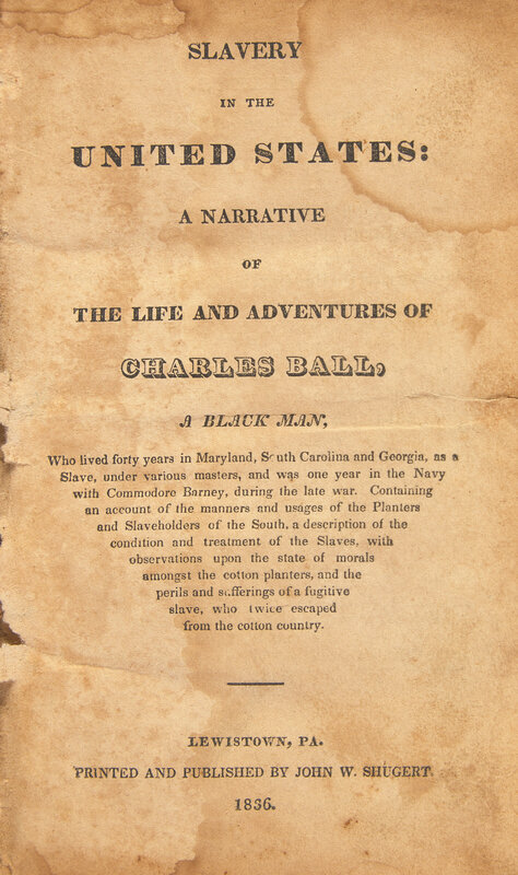 [African-Americana] Ball, Charles. Slavery in the United States: A Narrative of the Life and Adventures of Charles Ball, a Black Man; Who lived forty years in Maryland, South Carolina and Georgia, as a Slave...