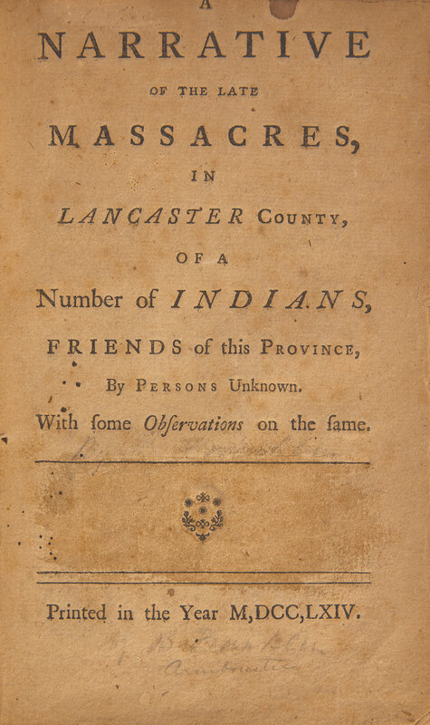 [Franklin, Benjamin] (Franklin, Benjamin) A Narrative of the Late Massacres, in Lancaster County, of a Number of Indians, Friends of this Province, by Persons Unknown. With some Observations on the same