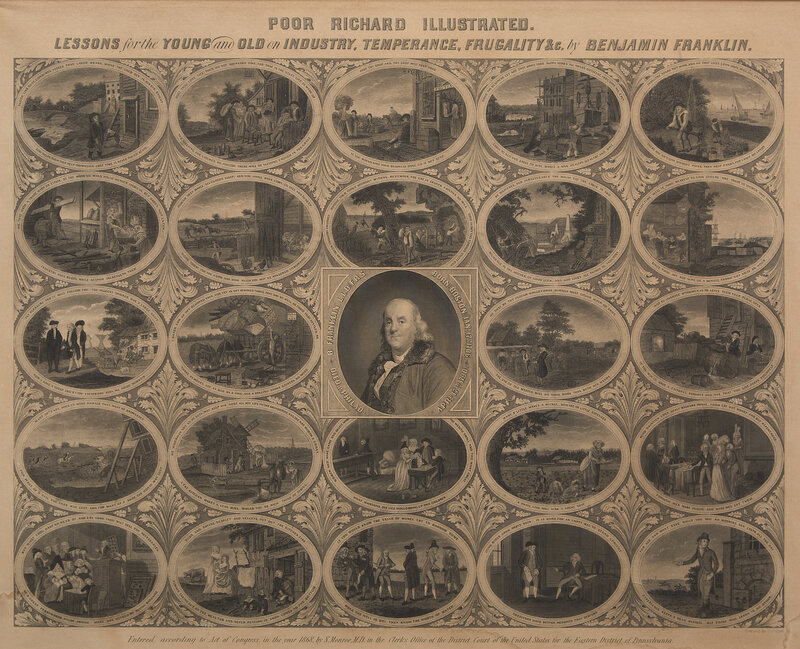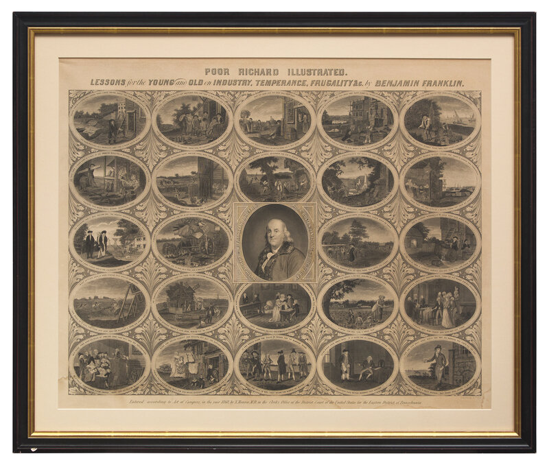 A fine engraving by Oliver Pelton (1792-1882) illustrating Benjamin Franklin's famed Poor Richard aphorisms, and showing 24 vignettes with a portrait of Franklin at center after Joseph Siffred Duplessis' painting.