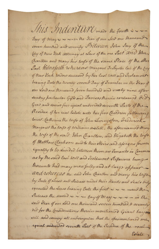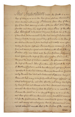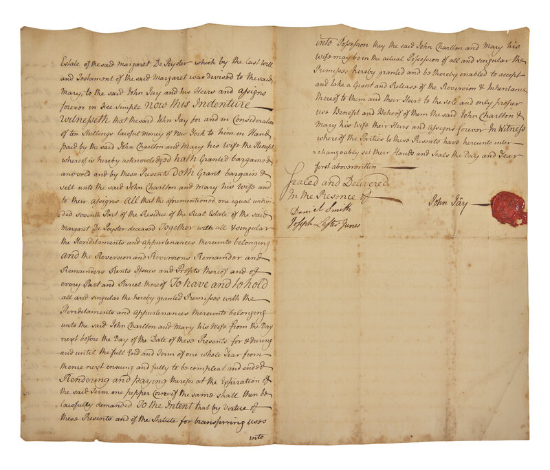(New York): May 4, 1770. Bifolium, 12 x 7 1/2 in. Autograph document, signed by John Jay, being an indenture between himself and Dr. John Charlton of New York; co-signed by Daniel Smith and Joseph Lester, Jr. Docketing on verso presumably also in Jay's hand. Wax seal intact; creasing from old folds; scattered foxing.