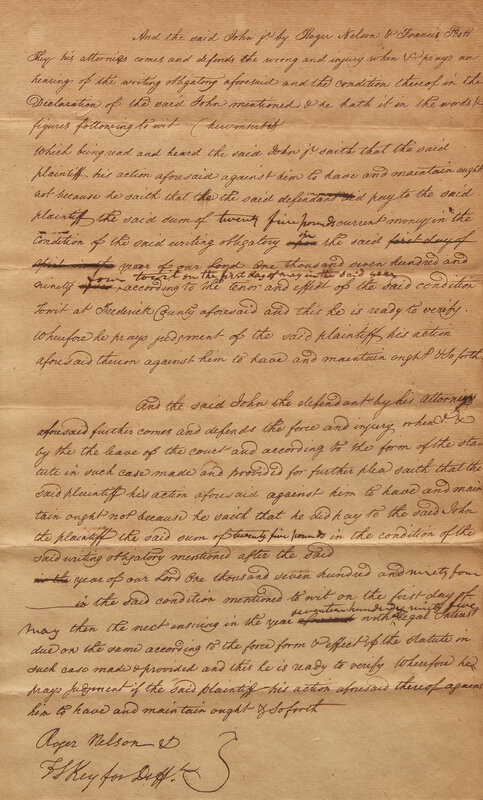 A scarce autograph legal document, signed by the author of the Star Spangled Banner, Francis Scott Key (1779-1843). Here, Key and his co-counsel, Roger Nelson (1759-1815), defend a man named John, Jr. in a case relating to an unpaid debt.