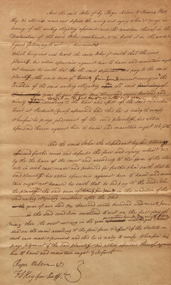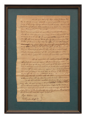 (Frederick County, Maryland, no date ca. after 1801). Single sheet, 12 7/8 x 8 in. (327 x 203 mm). Portion and draft autograph legal document, signed by Francis Scott Key as defense attorney representing a "John, Jr." ("FS Key for Defs."); counter-signed by his co-counsel, Roger Nelson. Docketed on verso. Sheet toned; creasing from old folds. In frame, 16 1/4 x 11 1/2 in. (413 x 292 mm).