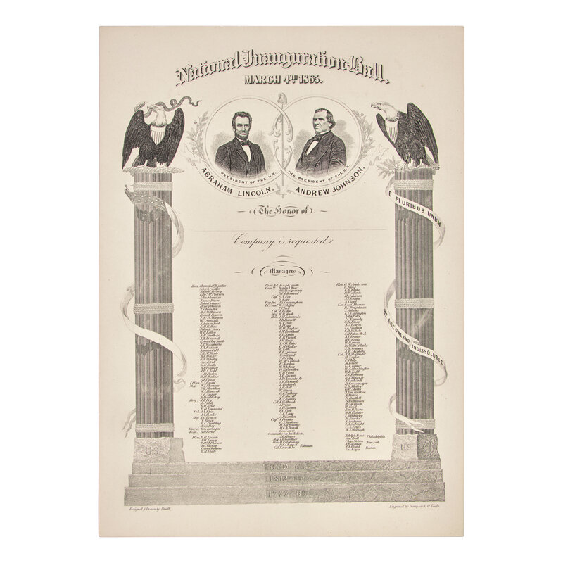 (Washington, D.C.): Engraved by Dempsey & O'Toole, after a design by Joseph Goldsborough Bruff, 1865. Engraved invitation with jugate portraits of Lincoln and Andrew Johnson at top. Bottom right corner lightly bumped. 10 7/16 x 7 1/2 in. (265 x 190 mm).