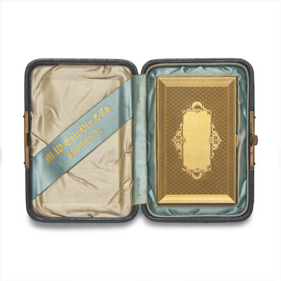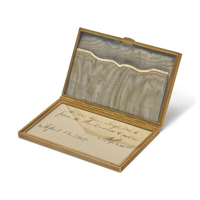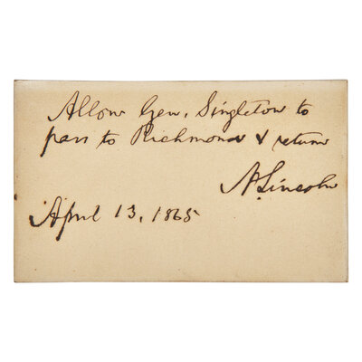 (Washington, D.C.), April 13, 1865. Single oblong card, 2 1/8 x 3 3/8 in. (54 x 86 mm). Autograph note, signed by Abraham Lincoln as President, being a pass for General James W. Singleton to travel through Union lines into Richmond, Virginia: "Allow Gen. Singleton to / pass to Richmond & return / A. Lincoln / April 13, 1865". In contemporary custom solid 18kt gold box (74 dwt), and in original silk-lined leather case, by M.W. Galt, Bro. & Co. Washington, D.C. Basler 8: 410