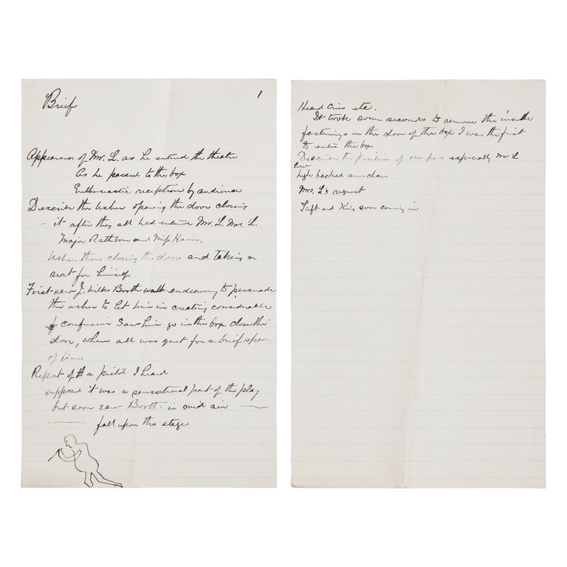 No date, ca. 1880s-1900s. Two ruled sheets, 8 x 5 1/8 in. (203 x 130 mm). Autograph document in the hand of Dr. Charles A. Leale, with a small doodle of a figure representing John Wilkes Booth at bottom. Creasing from old folds.