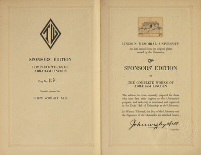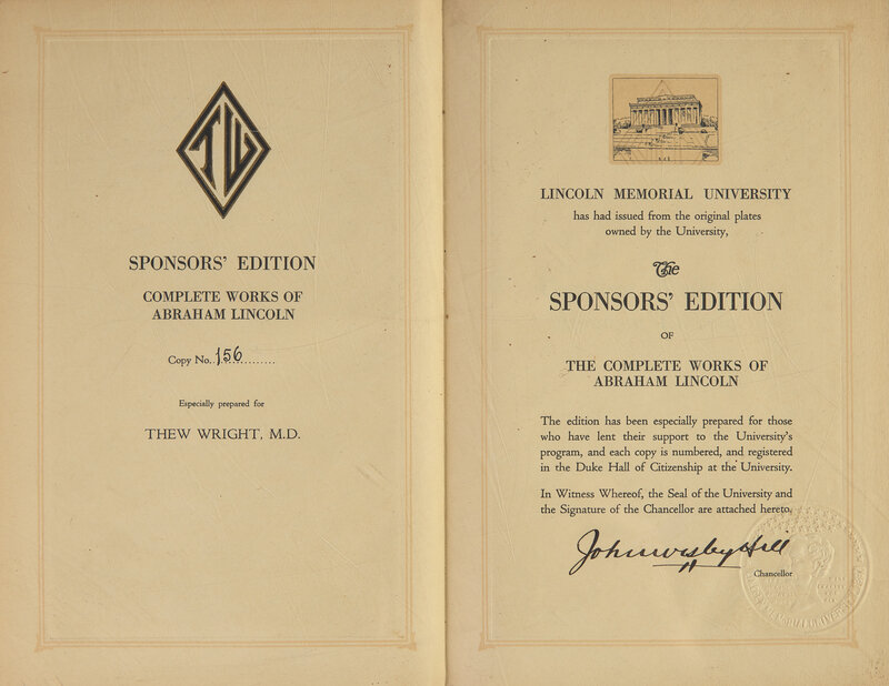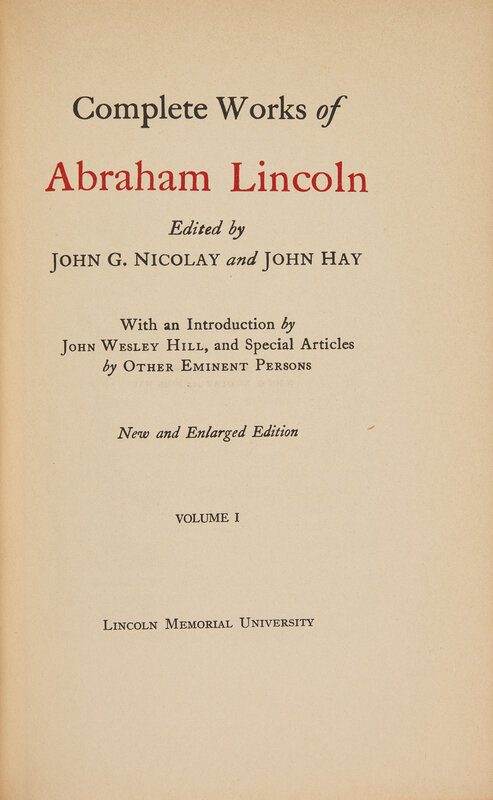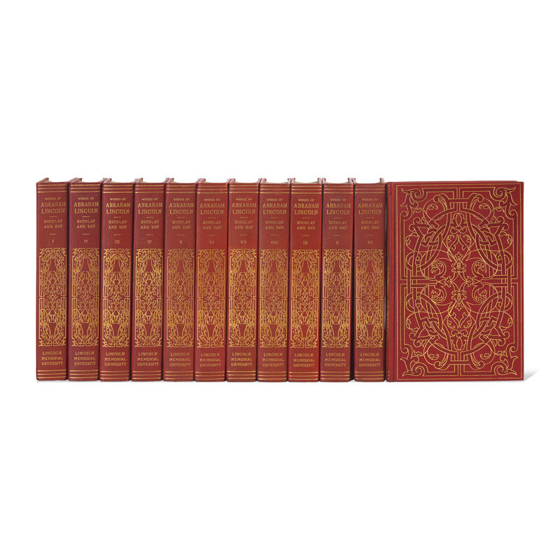 (Harrogate, Tennessee): Lincoln Memorial University, (1894). In 12 volumes. Sponsors' Edition, #156 of an unspecified limitation, prepared for Thew Wright and signed by Chancellor of the university, John Wesley Hill. Edited by John G. Nicolay and John Hay. Title-pages printed in black and in red. Illustrated with frontispiece portrait in each volume and plates and facsimiles throughout set. Full red cloth, elaborately stamped in gilt; top edges gilt, other edges trimmed; Wright's large book-plate on front paste-down of each volume.
