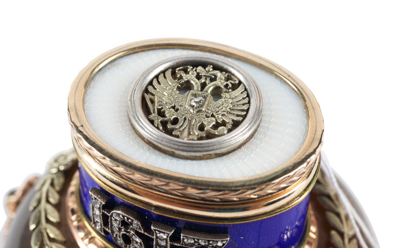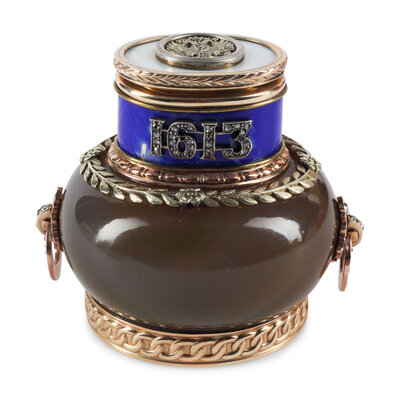 A 14-Karat Gold, Guilloché Enamel and Diamond Mounted Agate Jar