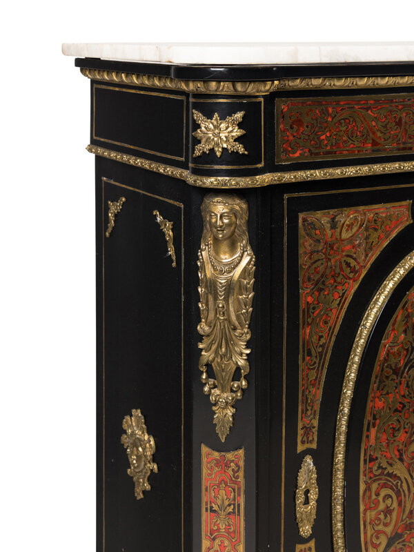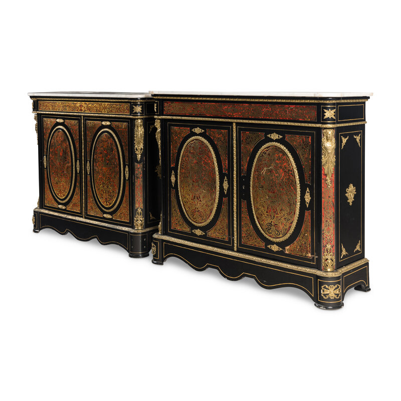 A Near Pair of Napoleon III Boulle Marquetry Marble-Top Side Cabinets