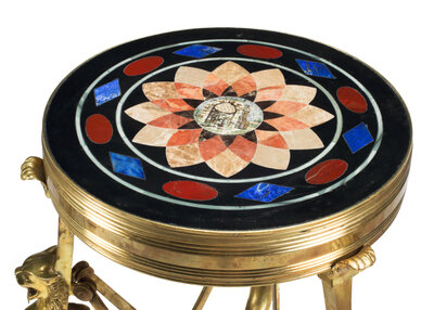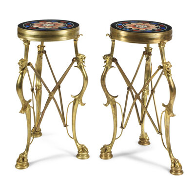 A Pair of French Neoclassical Style Gilt Bronze, Specimen Marble and Micromosaic Tables