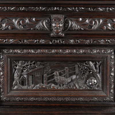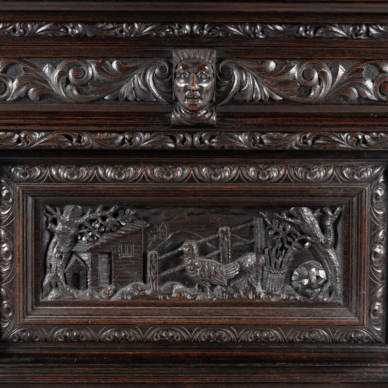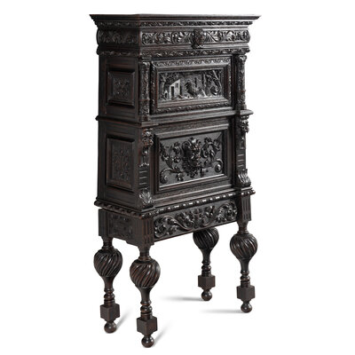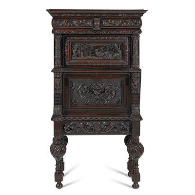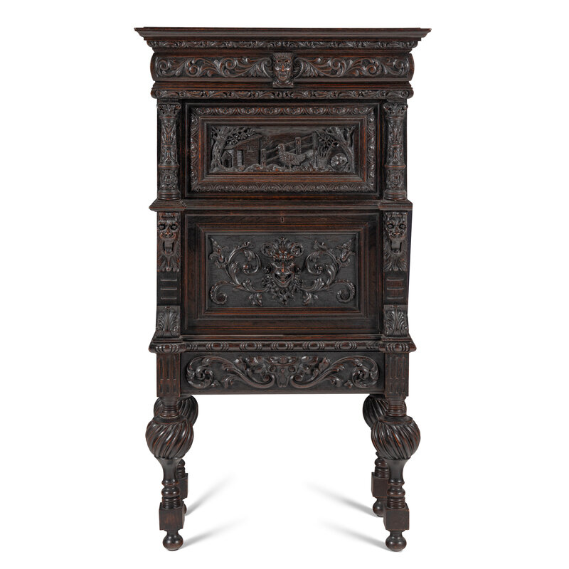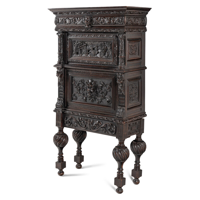 An Italian Renaissance Revival Carved Oak Bureau Cabinet on Stand