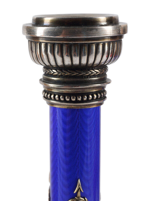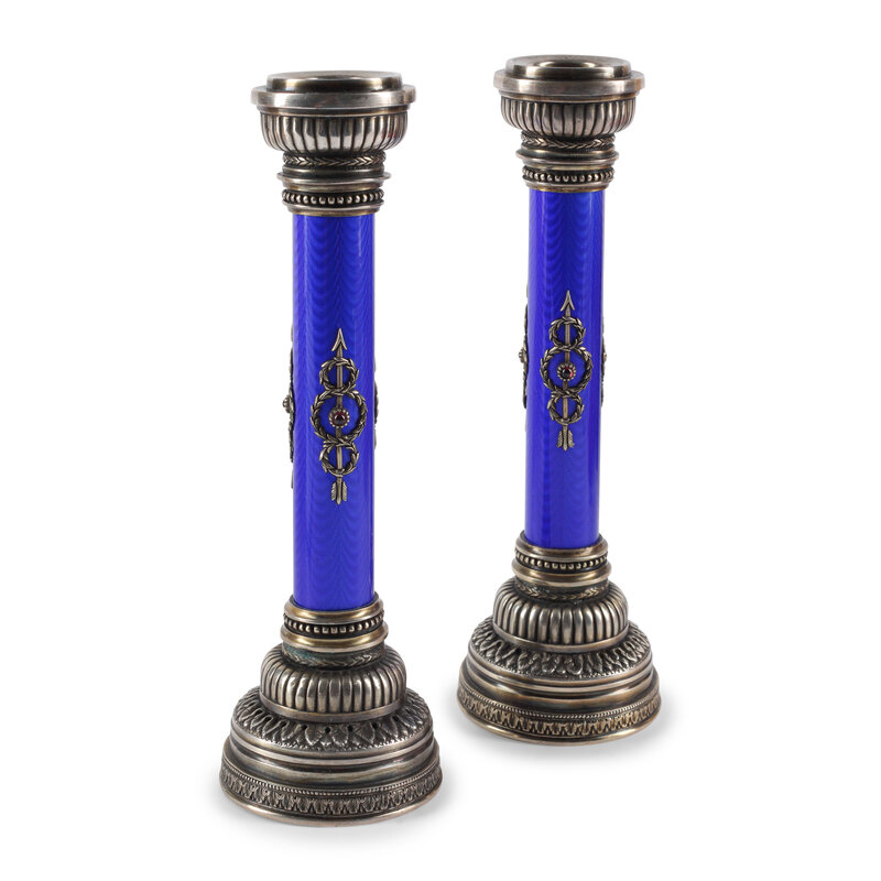 A Pair of Silver, Guilloché Enamel and Gemstone Mounted Candlesticks
