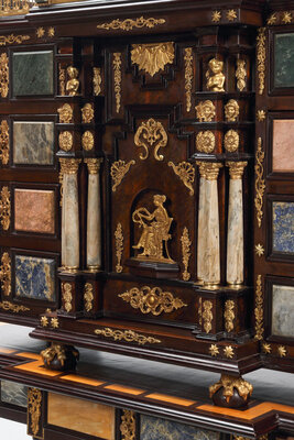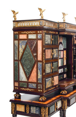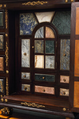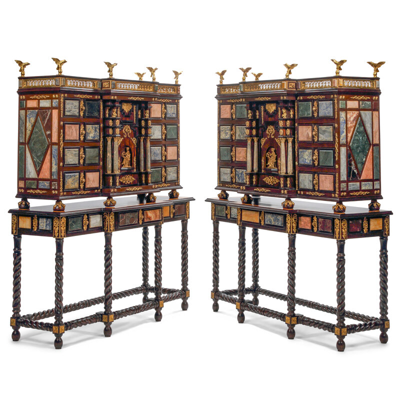 A Pair of Italian Specimen Marble-Inset and Gilt Bronze Mounted Collector's Cabinets on Stands