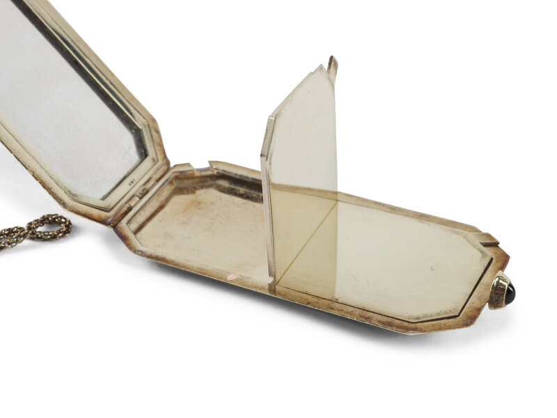 the case with an engraved monogram and opening to an interior with two compartments and a mirror.