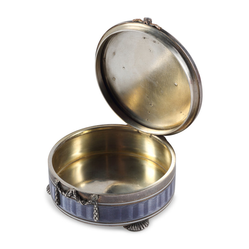 A Silver, Gold, Guilloché Enamel, Diamond and Ruby-Mounted Box