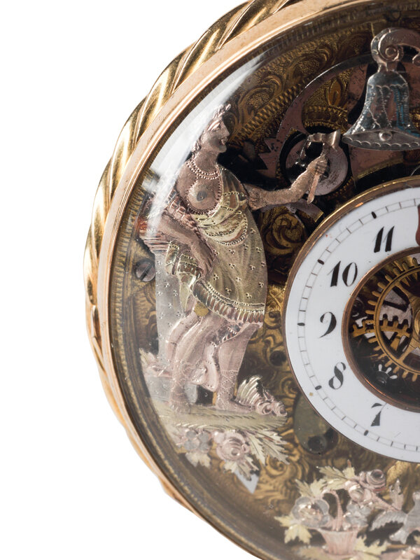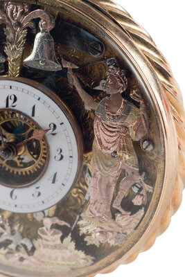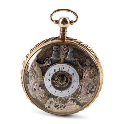 having a keywound movement, the enamel dial surrounded by a vari-color gold scene of flaking Classical figures striking bells.