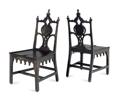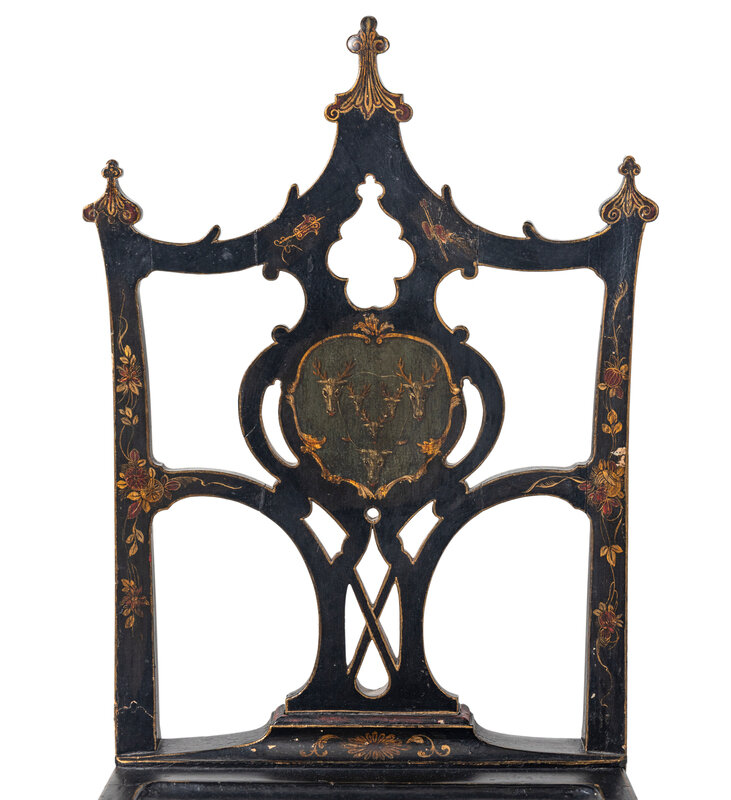 decorated to simulate Japanning, the splats centered with a shield crest and stag heads.