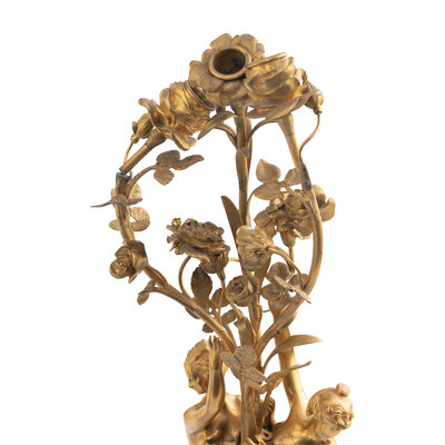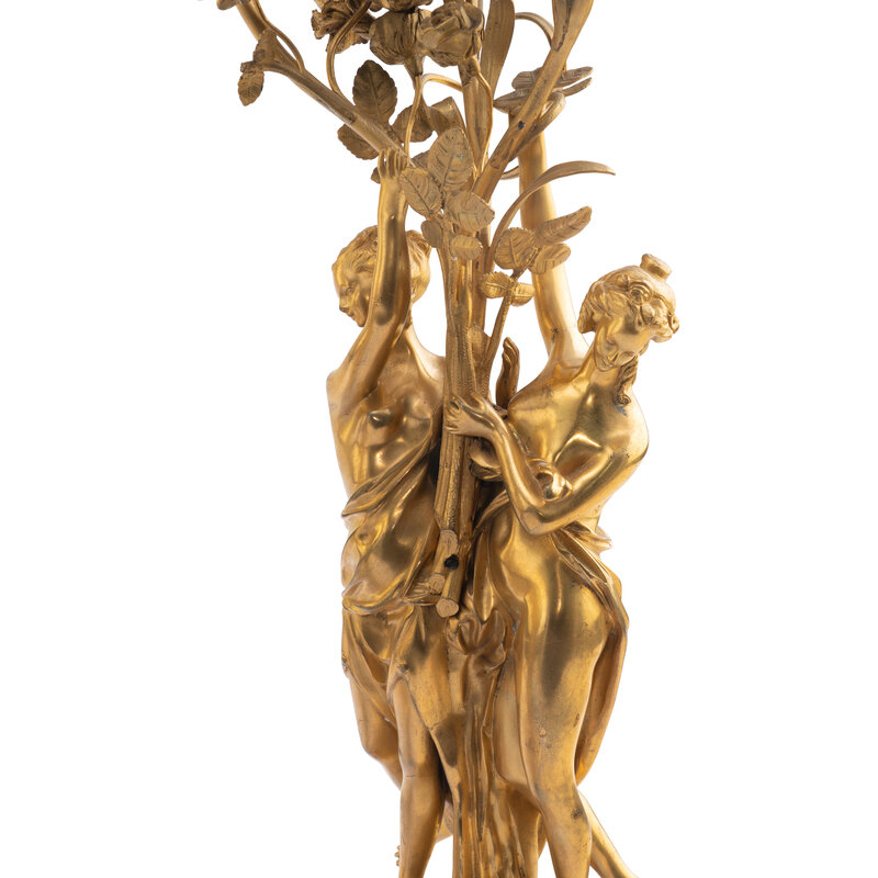 Height of clock 32 1/2 x width 14 x depth 14 inches; height of candelabrum 28 inches.