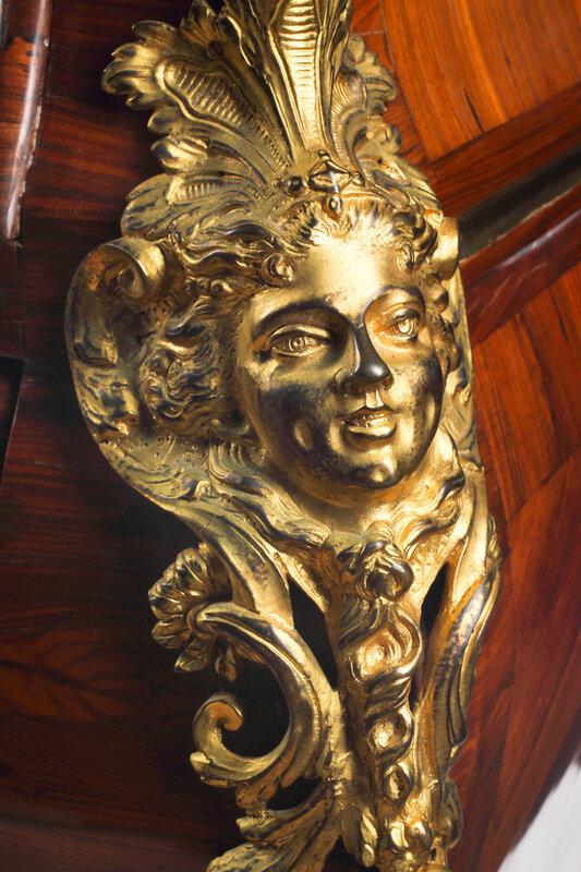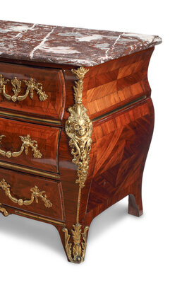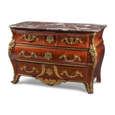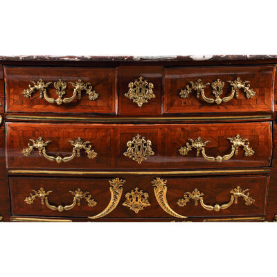 A Régence Gilt Bronze Mounted Marquetry Marble-Top Commode