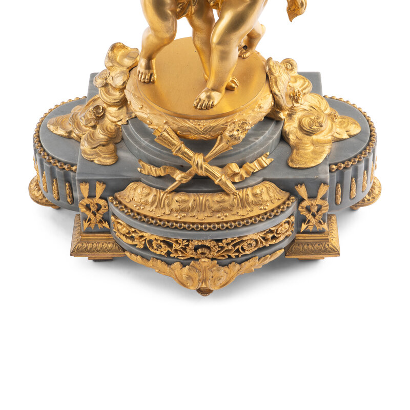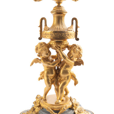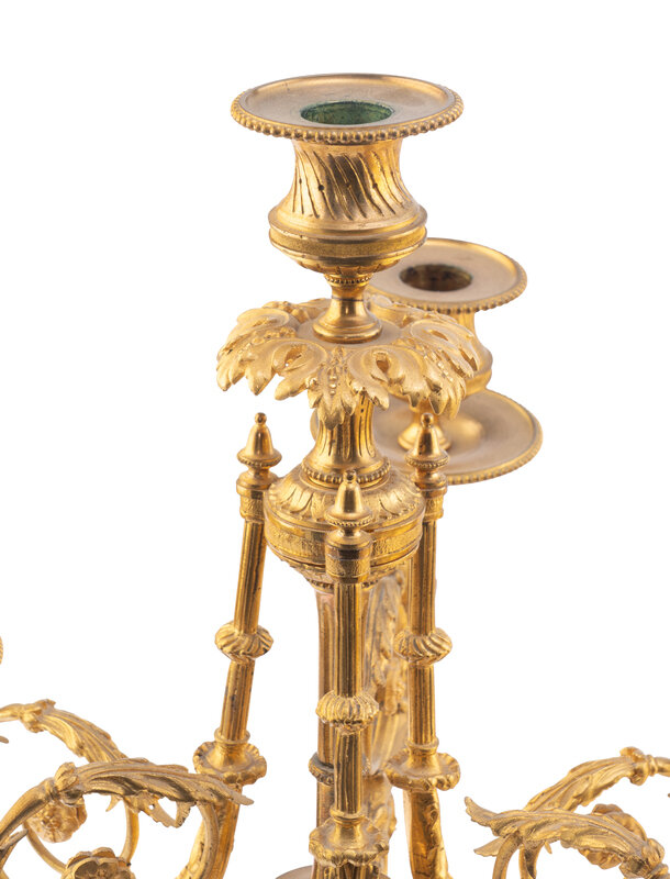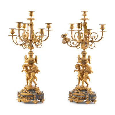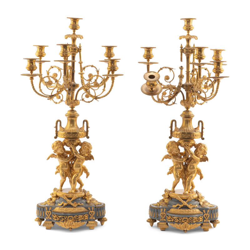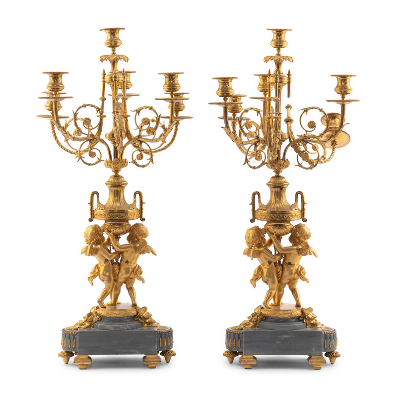 A Pair of Louis XV Style Gilt Bronze and Persian Grey Marble Six-Light Candelabra