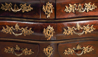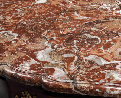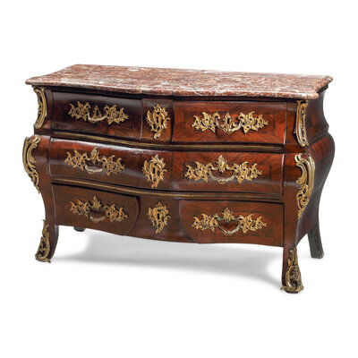 A Louis XV Gilt Bronze Mounted Marquetry Marble-Top Commode
