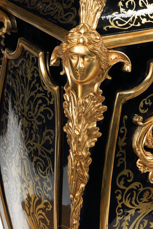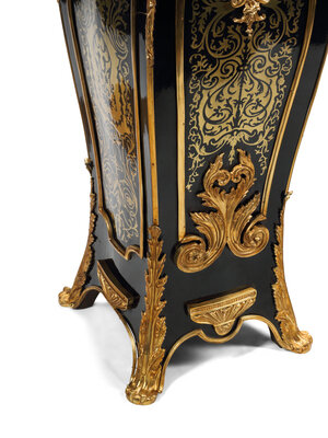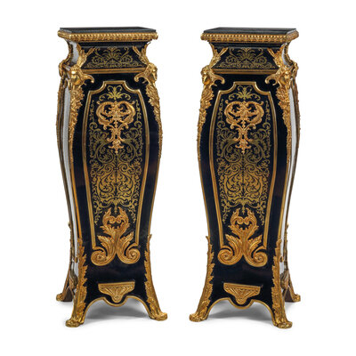 A Pair of Louis XV Style Gilt Bronze Mounted Boulle Marquetry Marble-Top Pedestals