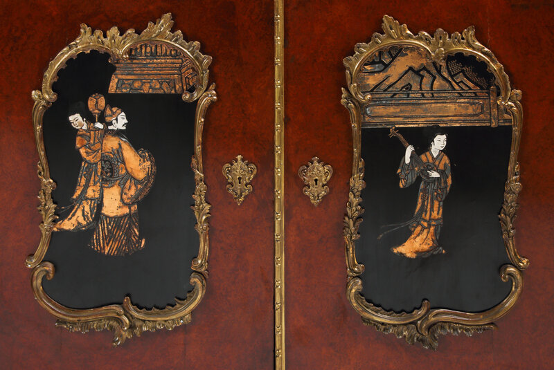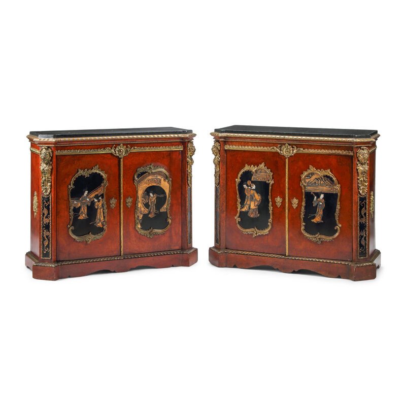 A Pair of Louis XV Style Burl Walnut Lacquer-Inset and Gilt Bronze Mounted Cabinets