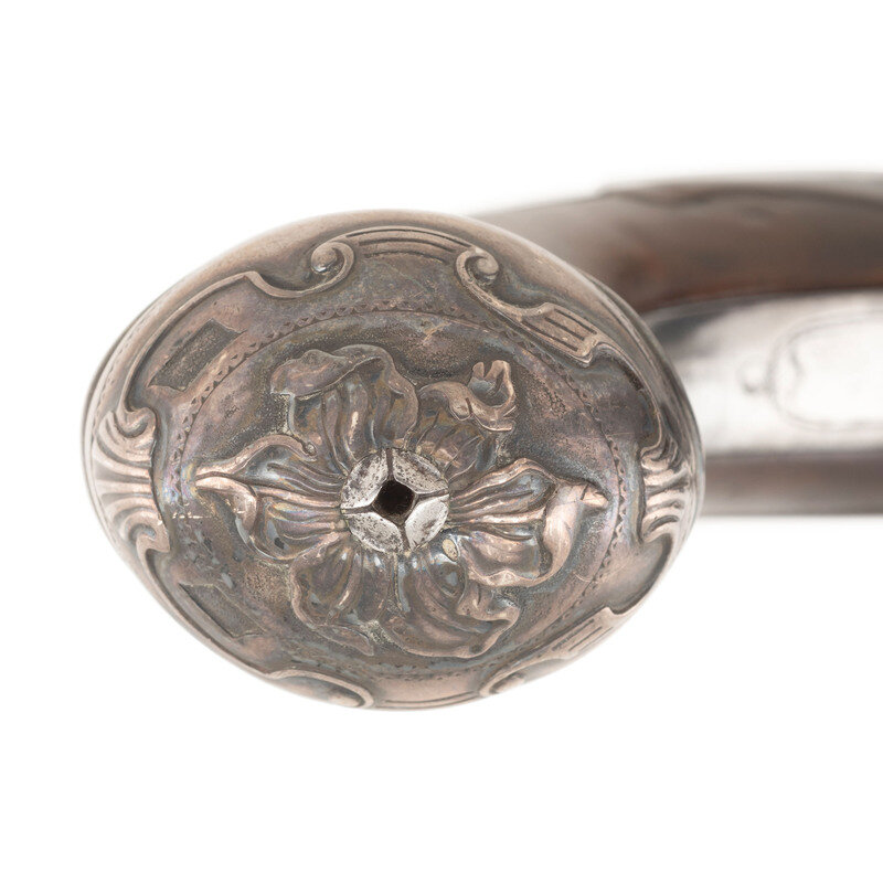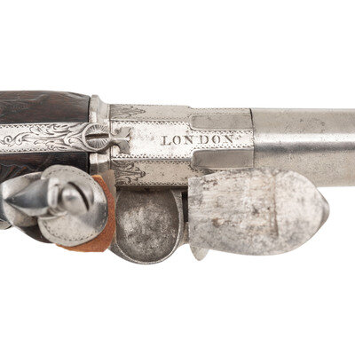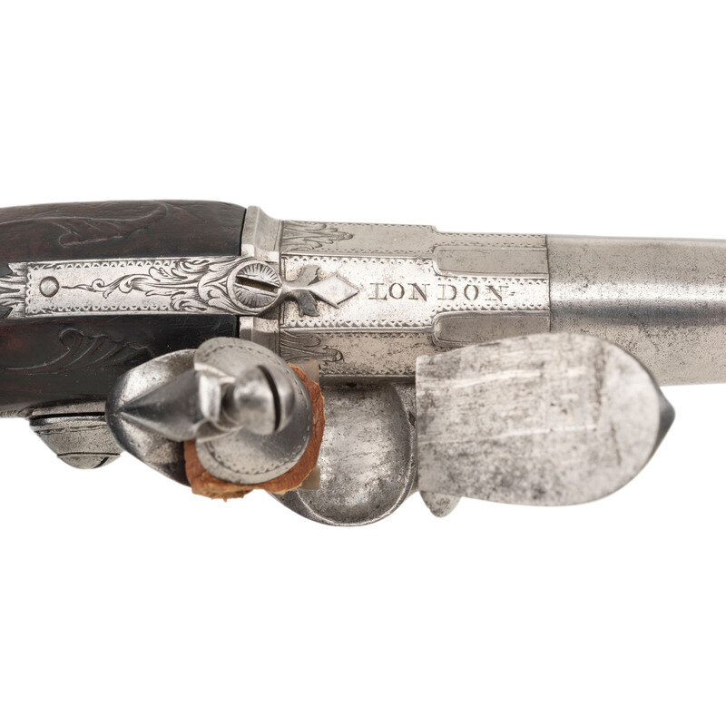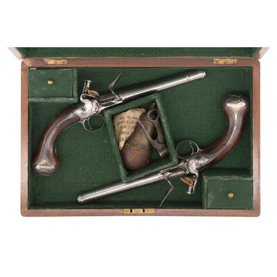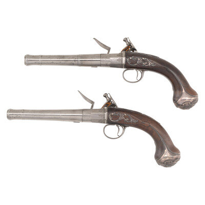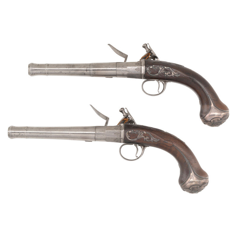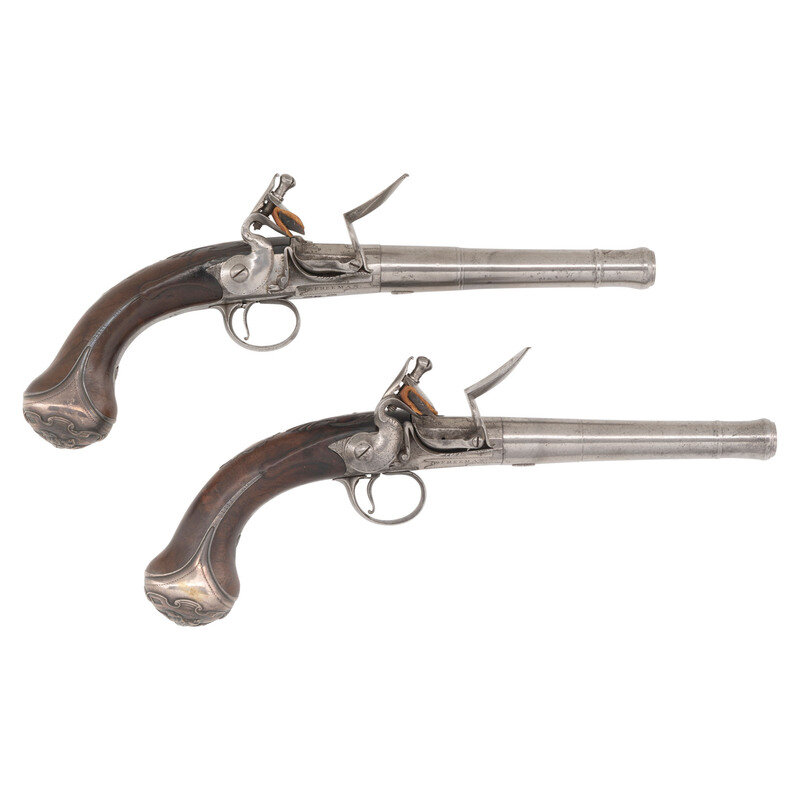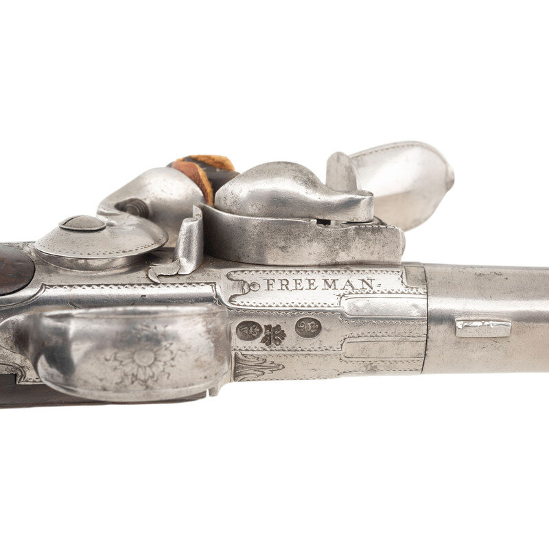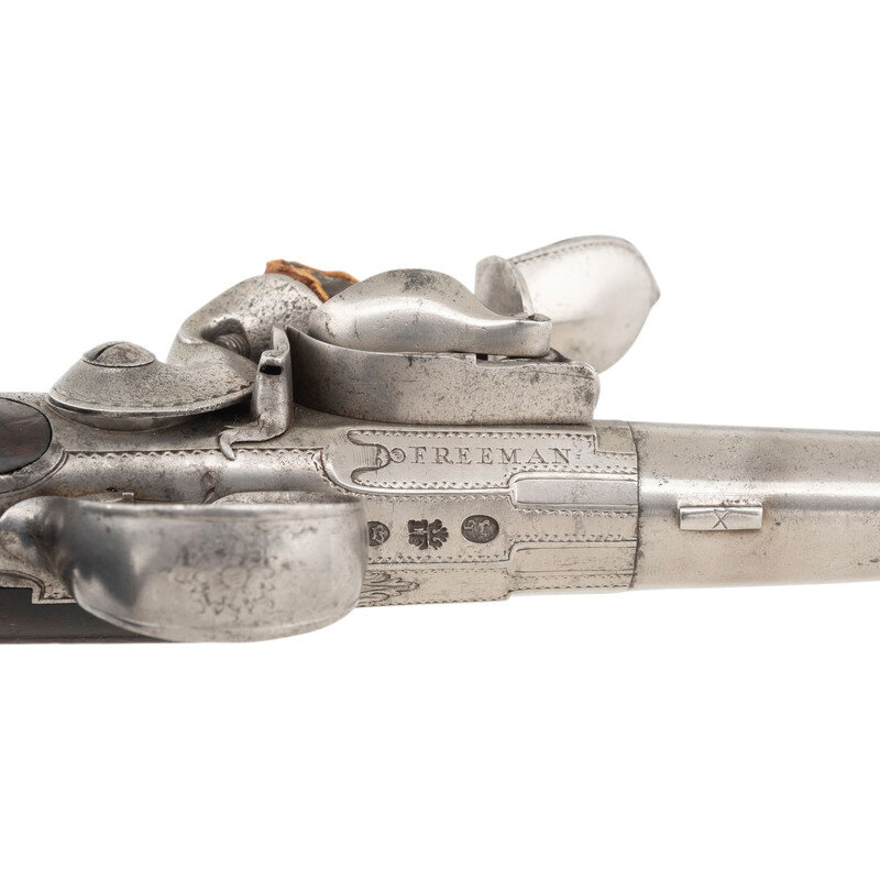 .60 caliber. 5.5" round cannon muzzle twist-off barrels. NSN. Bright finish, iron furniture, silver plated floral pattern brass buttcaps, walnut stocks. Single shot twist-off flintlock pistols without sights. Lower right of frames marked FREEMAN with the bottom of the frames showing London Gunmaker's Company commercial proof marks and the touchmark of James Paul Freeman who worked in London during the first half of the 18th century. Tops of barrels marked LONDON. Stocks with raised carved shell motifs around the tangs and German silver wrist escutcheons. Cocks and frame with light engraving. The pistols are contained in a reconfigured modern wooden case with accessories that include an old pistol flask and a combination bullet mold and barrel wrench and is not the right size or caliber for the guns. Some lead balls are present as well, none correct for the guns. {ANTIQUE}