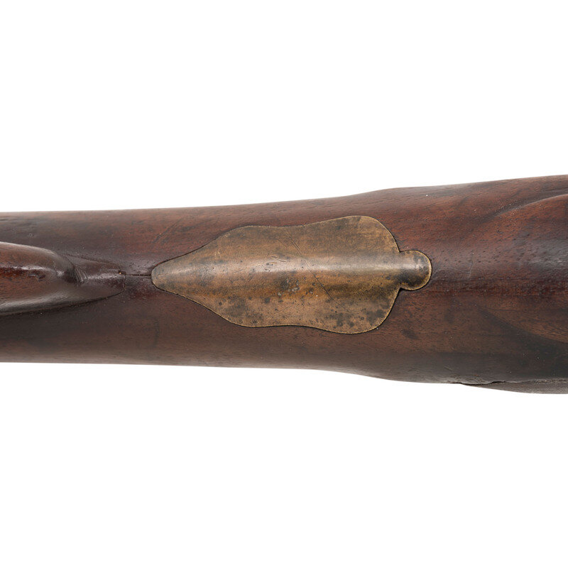 .75 caliber. 40.5" pinned barrel. NSN. Heavily oxidized metal, brass furniture, stretched walnut stock. Single shot muzzleloading reconverted flintlock musket with replacement iron ramrod. Illegible lock markings, only a small letter is visible on the barrel. Stock and furniture restored and replaced from the entry pipe forward. Most external lock components are aged reproduction parts. {ANTIQUE}