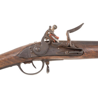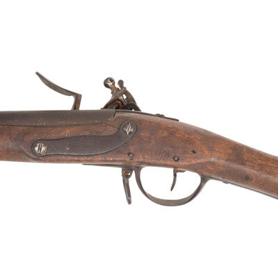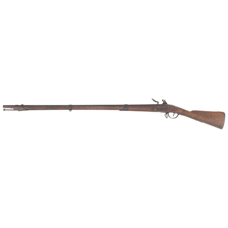 .72 caliber. 42" barrel. NSN. Heavily oxidized metal, iron furniture, walnut stock. Single shot flintlock musket with socket bayonet lug under barrel about 2" from the muzzle, sling swivels and an iron ramrod. Musket of nominally French 1763/66 pattern with a stepped M1754 style lock that appears to be in original flint and which seems to have been in the gun for a very long time. Touchhole bored out and over sized. Markings weak. {ANTIQUE}