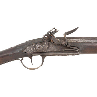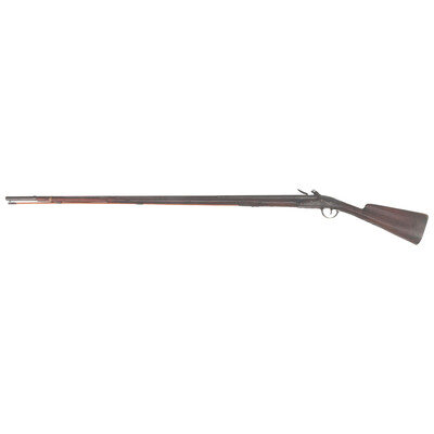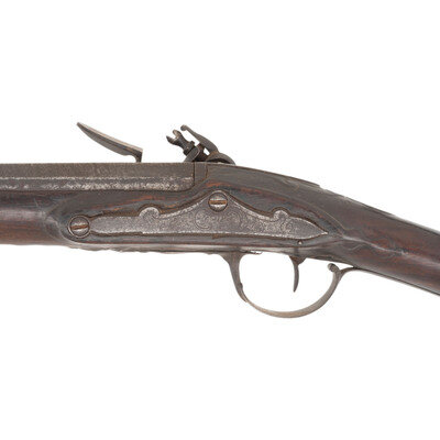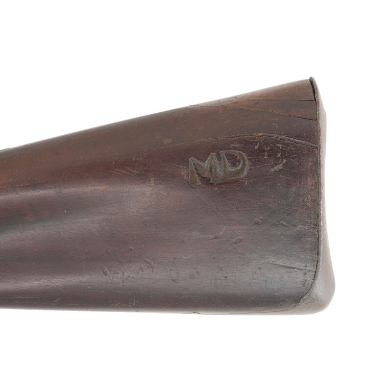 .60 caliber. 44" two-stage octagon to round wedge retained barrel. NSN. Bright finish, iron furniture, stretched walnut stock. Single shot flintlock muzzleloading long arm generally of the French "Fusil de Chasse" form. Flat flint lock is 5.25" in length with an integral faceted and bridled iron pan and a flat faceted swan neck cock. Lock appears to be in original flint, with some replaced internal small parts and is lightly engraved at the tail with no discernable maker's markings. Stock of traditional French form with a "Roman Nose "or "French" butt, that is deeply branded MD, possibly suggesting use by the colony of Maryland during the Colonial period. A small socket bayonet lug is attached to the bottom of the barrel, about .25" from the muzzle. The last 11" or so of the forend are restored and spliced to the stock with an added iron ramrod pipe and brass band. A reproduction ramrod is present. {ANTIQUE}