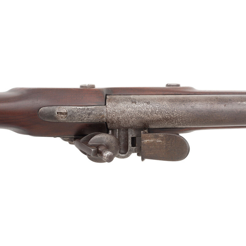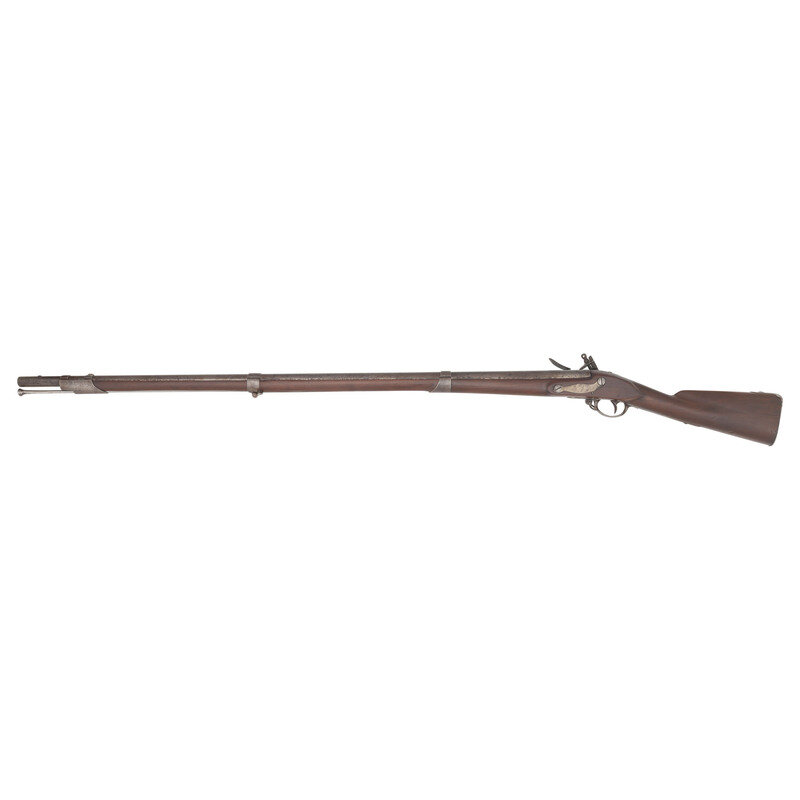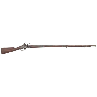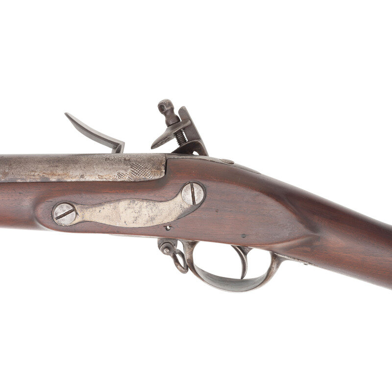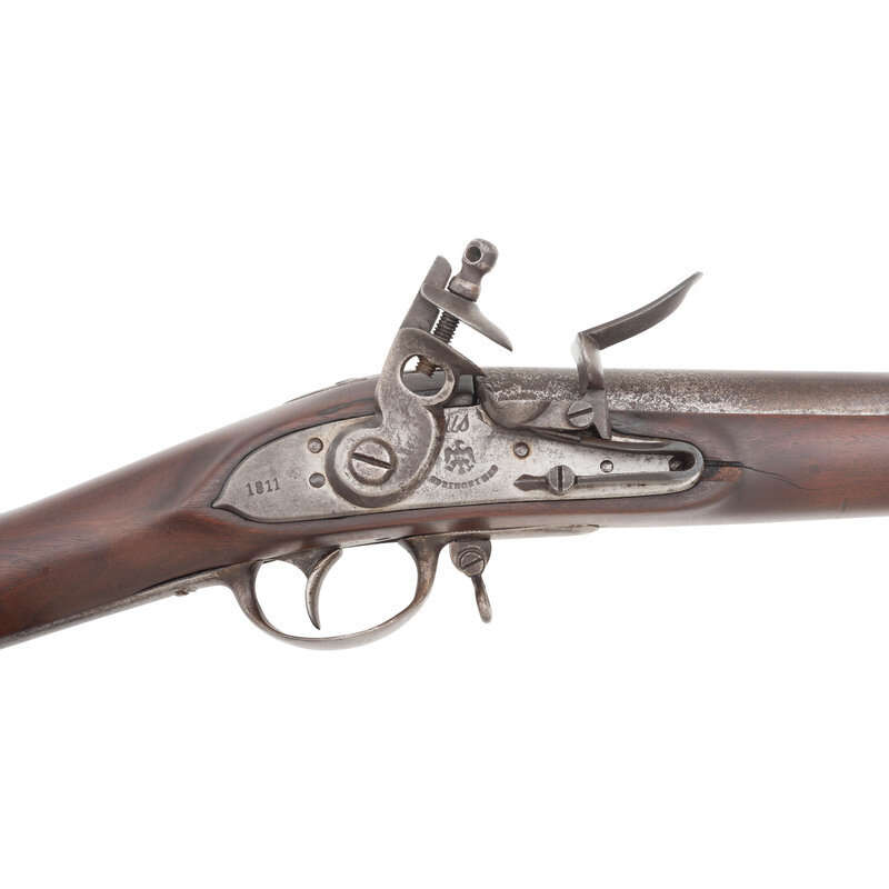 .70 caliber. 44.75" barrel. NSN. Bright finish, iron furniture, full-length walnut musket stock with three flat, spring retained barrel bands. Single shot smoothbore muzzleloading flintlock musket with no rear sight, brass blade front sight on the rear strap of the upper barrel band, a socket bayonet lug on top of the barrel, 1.5" from the muzzle, a pair of screw retained bell shaped sling swivels and a button head ramrod. The 6.25" flat beveled lock has a pronounced teat at the rear and is marked with a script US/{Spread Winged Eagle}/SPRINGFIELD below the pan and dated 1811 horizontally at the tail. The lock has an integral, rounded, fenced and bridled iron pan. The frizzen toe is straight and the frizzen spring terminates in a rudimentary diamond shape. The flat beveled cock is reinforced and has a heart shaped cut out with a straight cock's comb. The lock is in its original flint configuration. The touchhole is somewhat oversized but is well placed in the pan, shows some moderate erosion and retains no angle and taper. The breech is stamped with P/{Eagle Head}/V proof marks and a large US. The buttplate tang is dated 1811, matching the lock. A couple of sets of initials are neatly carved in the reverse of the butt. {ANTIQUE}