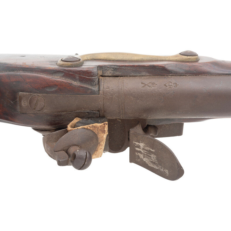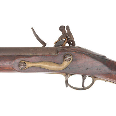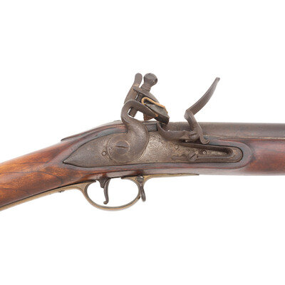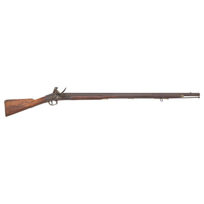 .76 caliber. 39" pinned round barrel. NSN. Bright finish, brass furniture, hardwood stock. Single shot muzzleloading smoothbore musket with no sights, socket bayonet lug on top of barrel near muzzle and sling swivels. Flint lock with swan neck cock and marked with the typical {CROWN}/GR and a small {Crown-Broad Arrow} as well as TOWER in an arc at the tail. Lock appears to be in original flint and not reconverted, although the hammer (frizzen) appears to be a modern cast replacement. Breech with {Crown/GR/Broad Arrow} and {Crown/Crossed Scepters} inspection marks. Stock does not bear any of the expected British assembly, inspection or storekeepers marks. Includes a button head steel ramrod. {ANTIQUE}