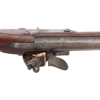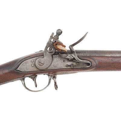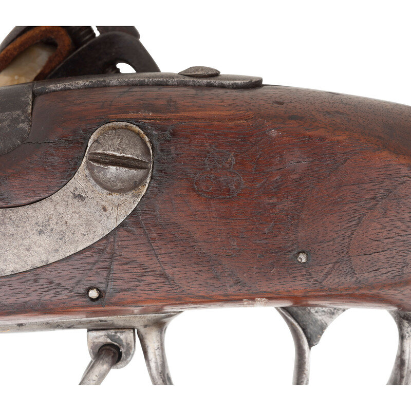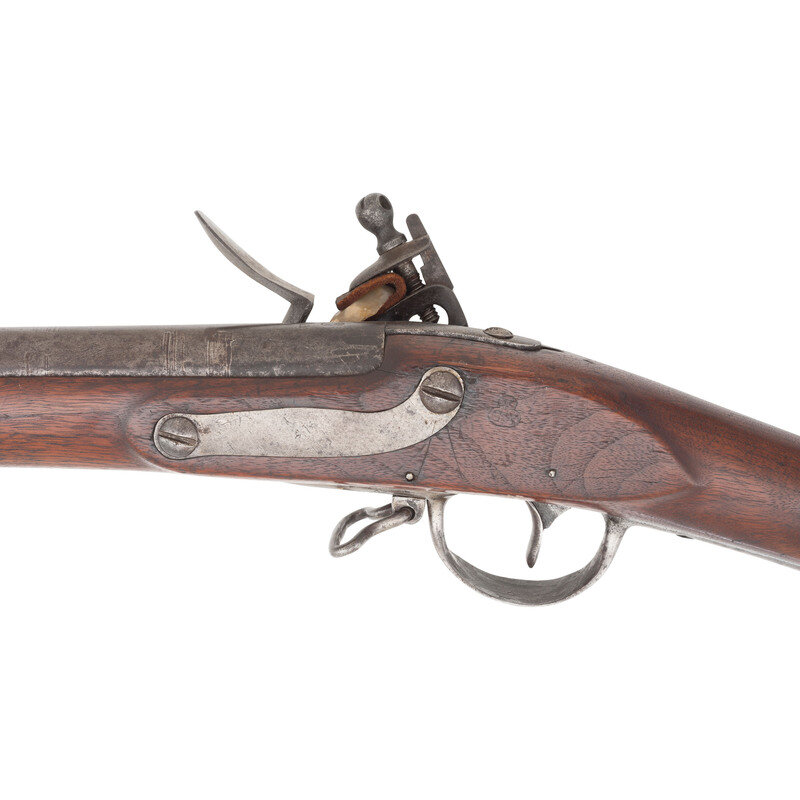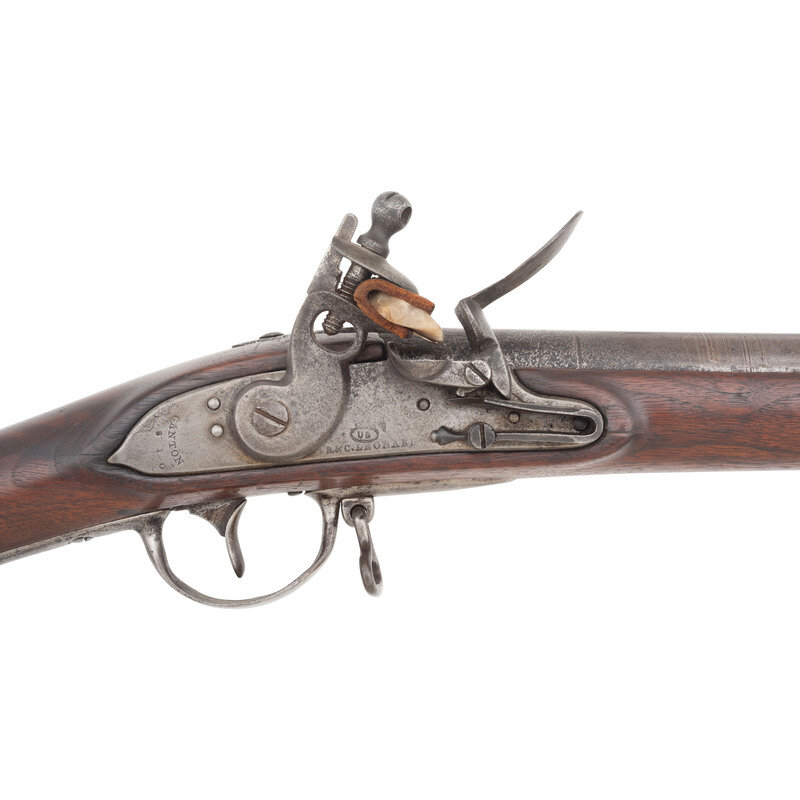 .69 caliber. 44.75" barrel secured by three flat, spring retained bands. NSN. Bright finish, iron furniture, walnut stock. Single shot muzzleloading flintlock musket with brass blade front sight, socket bayonet lug under barrel 1.125" from the muzzle, bell shaped screw secured sling swivels and a steel button head ramrod. Flat beveled flint lock with integral rounded and fenced iron pan and flat beveled reinforced cock is marked with an {Eagle}/US in a circle under the pan, over the contract name R.&C. LEONARD, and marked vertically in two lines at the tail CANTON in an arc and 1810. Breech marked US over a depressed cartouche with a raised right facing {Eagle Head} over CT inspection. According to Moller, the "CT" stands for "contract" and is only found on 1808 and 1812 contract muskets. Counterpane stamped with a legible V/CW in a cloverleaf cartouche. Lock remains in original flint configuration. Touchhole is poorly located in the pan and heavily eroded, with a somewhat awkward tang fit to the stock, suggesting the barrel may have been replaced at some point in time. Endoscopic examination of the breech shows no indications of welding or modification. Rudolph Charles Leonard of Canton, MA received a contract to produce 5,000 "Harpers Ferry" pattern muskets in October of 1808, and delivered a total of 3,867 between 1810 and 1814, with 200 delivered in 1810 and 1,125 being delivered during 1811. A scarce example of a War of 1812 period US M1808 contract musket in original flint. {ANTIQUE}