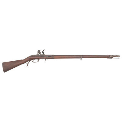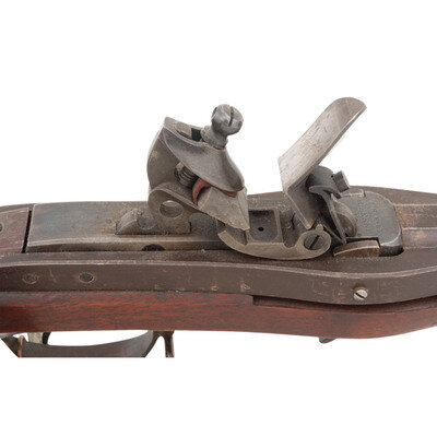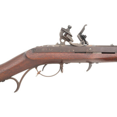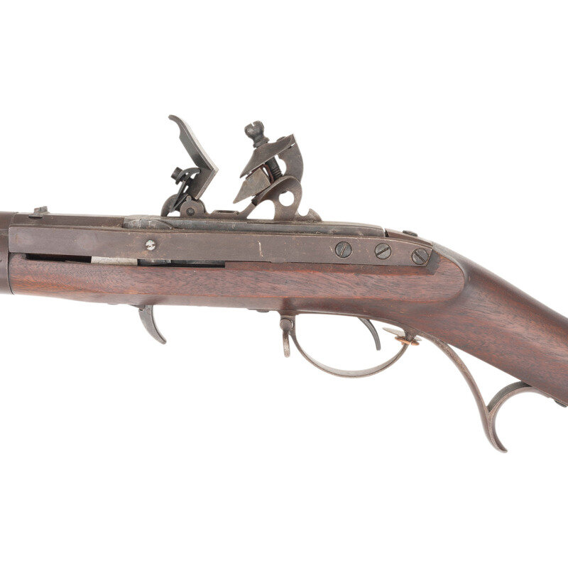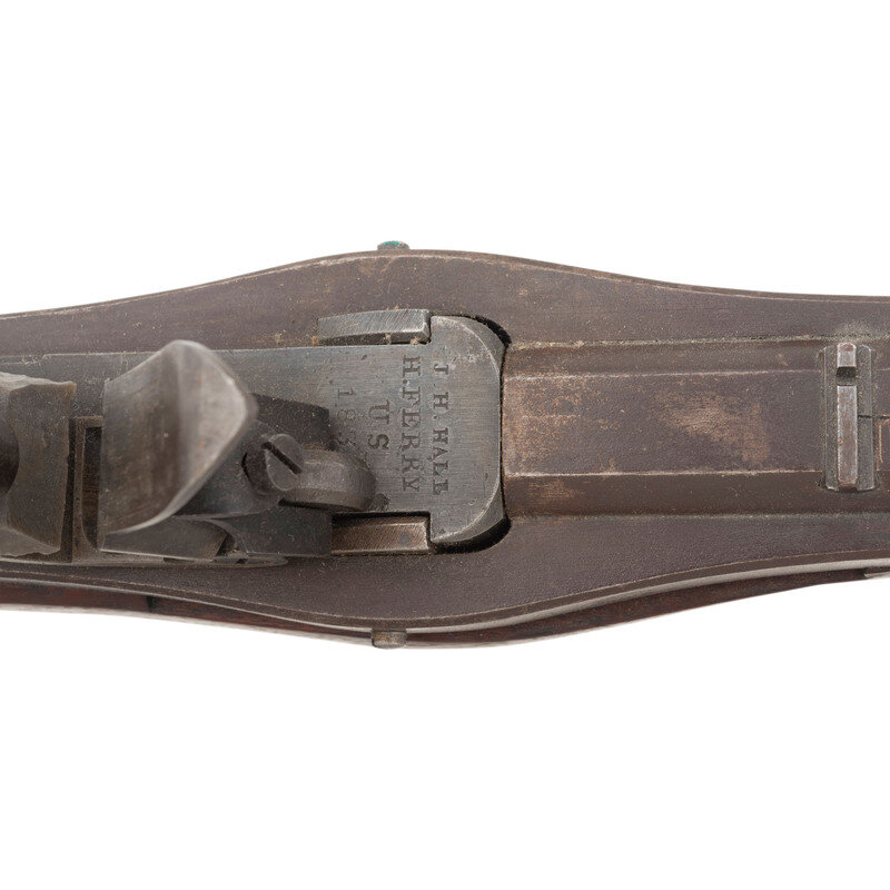.52 caliber. 32.625" round barrel secured by three pin-retained flat bands. NSN. Browned finish, color casehardened breech, iron furniture, smooth walnut stock. Single-shot, breechloading flintlock rifle with Hall's patent tilting breech block, fixed offset notch rear sight, offset blade front sight with base serving as the stud for a socket bayonet, sling swivels and a button head cleaning and clearing rod. Top of breech block marked in four lines: J.H. HALL/H. FERRY/US/1838. Action remains unaltered and in original flint. The Hall holds the distinction of being the first firearm to be produced on the principle of interchangeable parts at a US Arsenal. 19,680 Hall Rifles were produced at the Rifle Works at Harpers Ferry in three major production runs, 1819, 1823-24 and 1827-1840. This is fine example of a second production type produced in the third run of manufacturing, prior to the death of John H. Hall. A Springfield Armory brass collection tag with the accession number SA029 is attached to the triggerguard. {ANTIQUE}